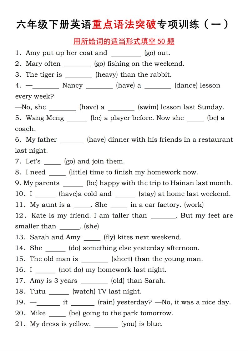 六年级下册人教PEP英语重点语法突破专项训练(一)完形填空