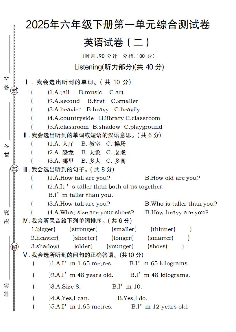 【英语】【人教pep版】2025年六年级下册第一单元综合测试卷英语试卷(二)