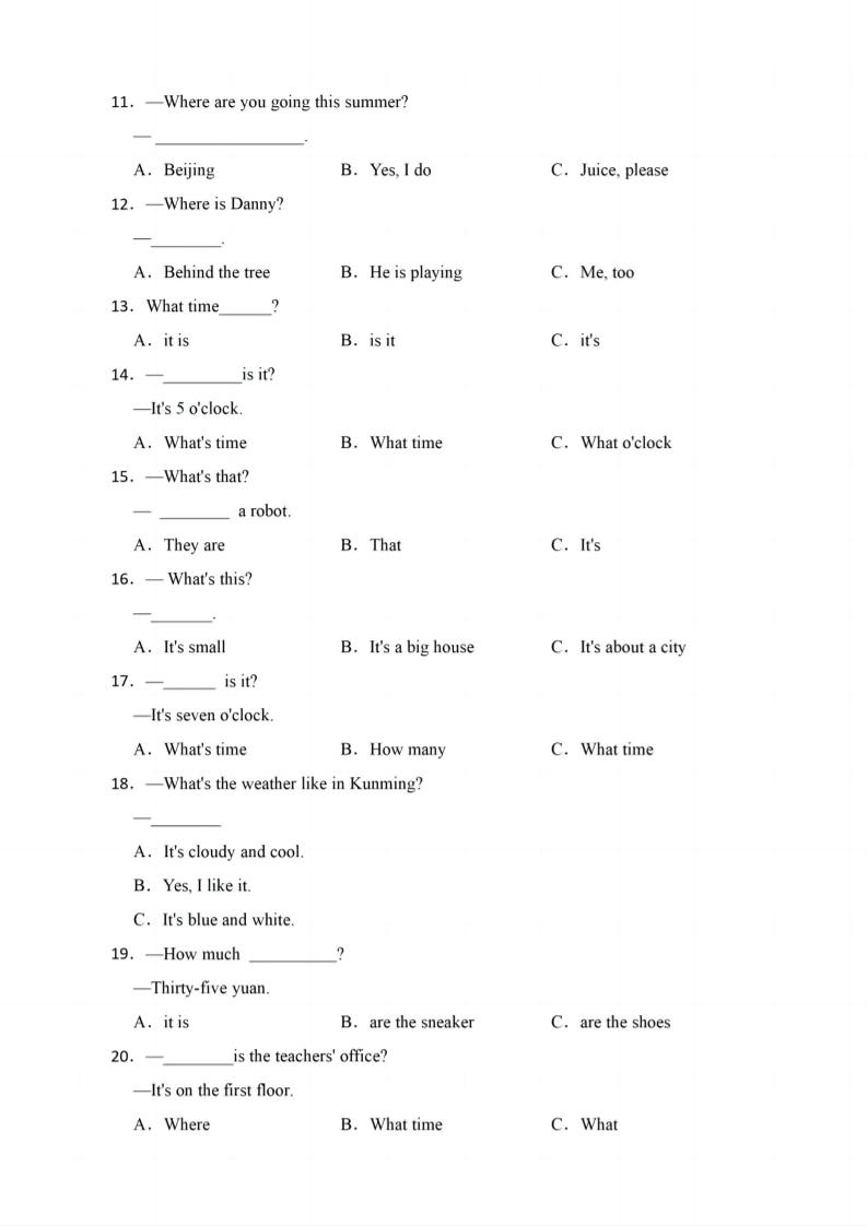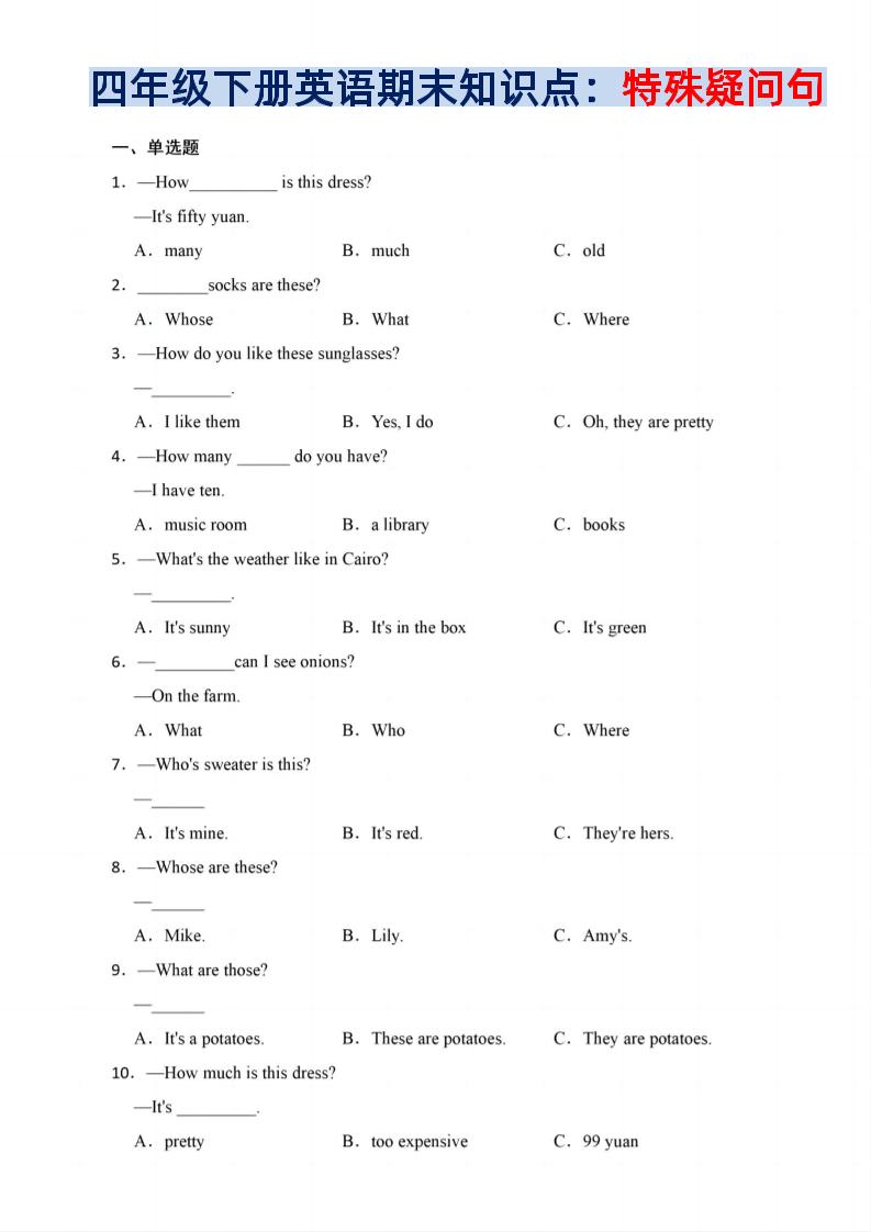 四年级下英语期末疑问句知识点训练《人教PEP版》
