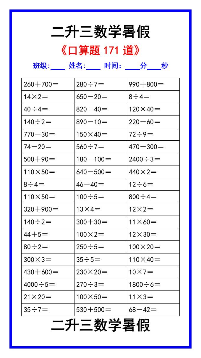 二升三数学暑假《口算练习题171道》汇总-三上数学