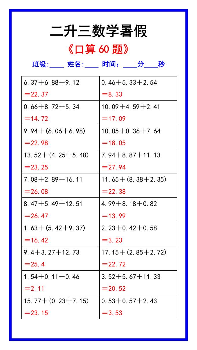 二升三数学暑假《口算练习60题》汇总-三上数学