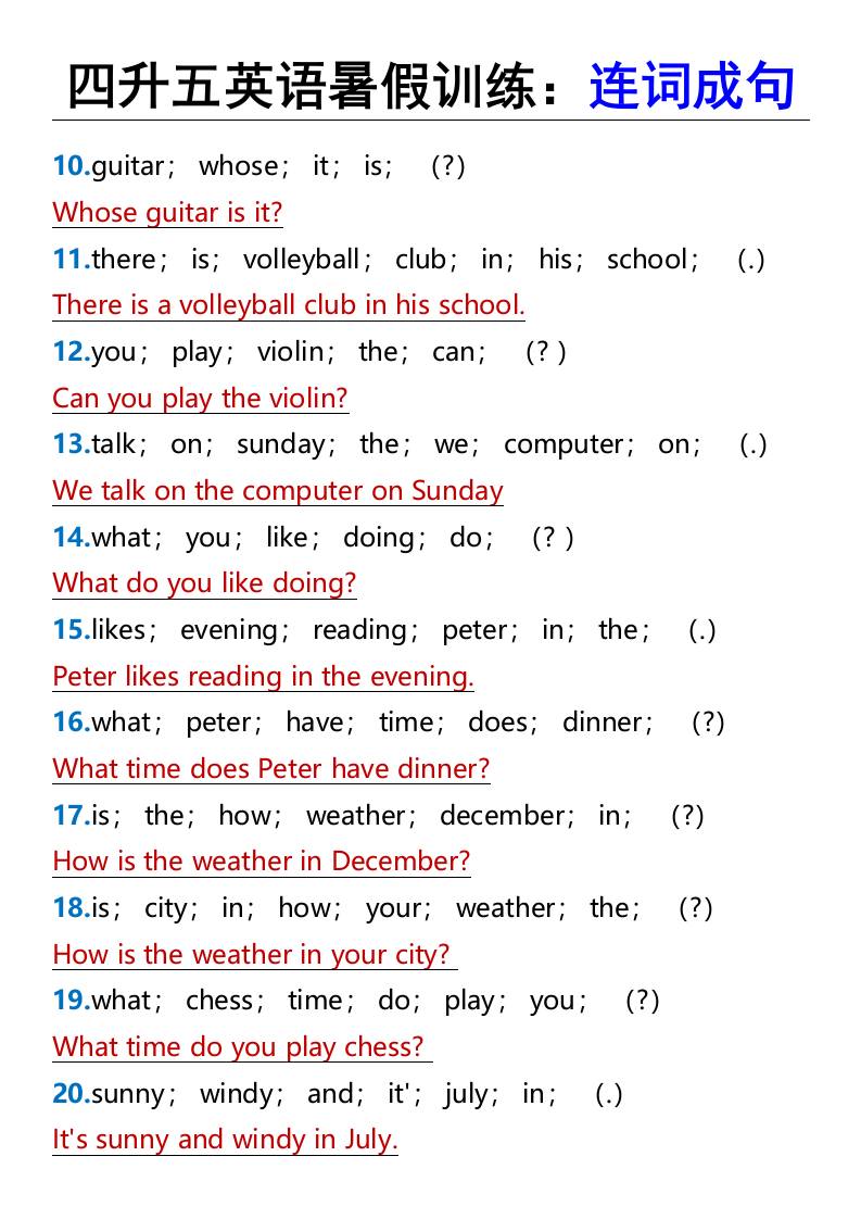 四升五英语暑假训练:连词成句-五上英语