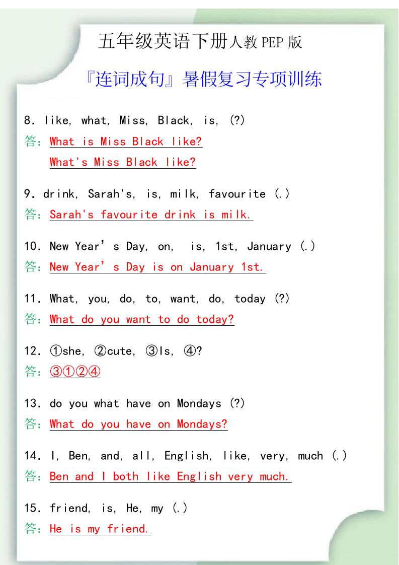 五年级英语下册『连词成句』暑假复习专项训练