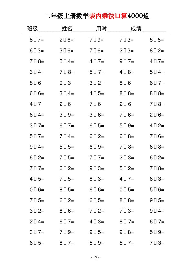 二上数学表内乘法口算4000道40页