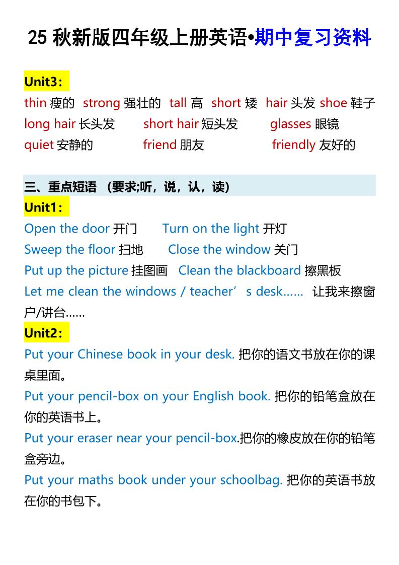 【2025秋新版】四年级上册英语•期中复习资料