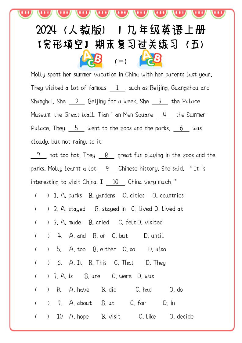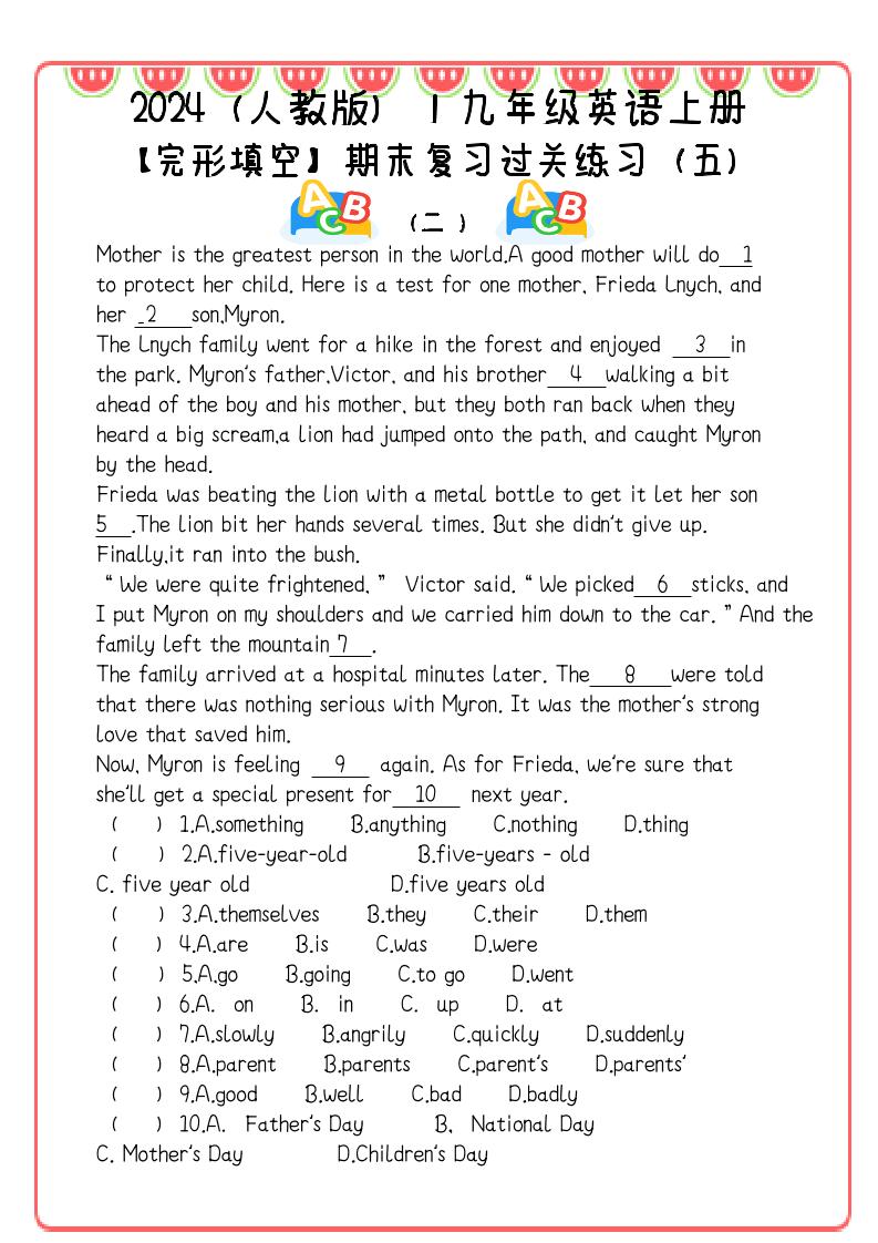 【2025秋新版】九年级英语上册:完形填空期末复习过关练习(5篇)