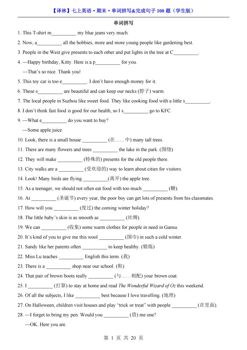 七年级上英语期末单词拼写完成句子100题(译林版)